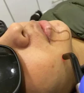 Con laser rojo para el tratamiento de herpes labial, cicatrización en 2 días.